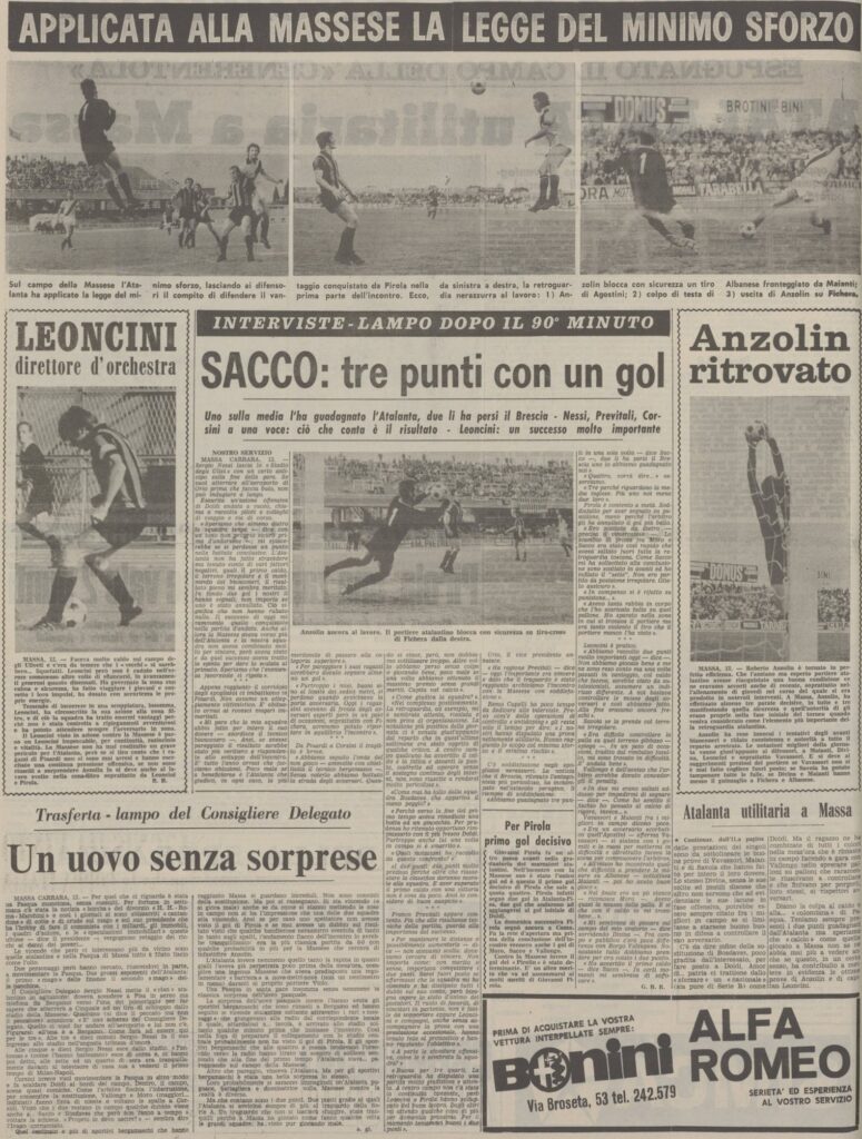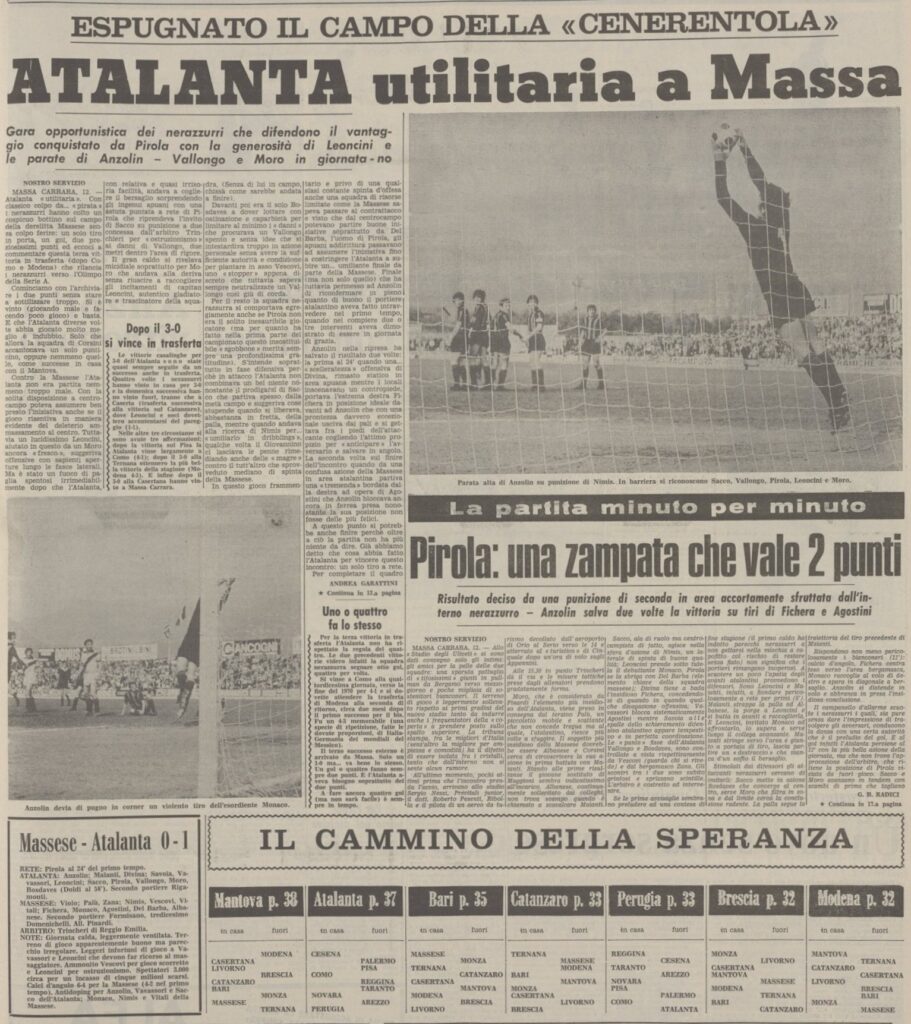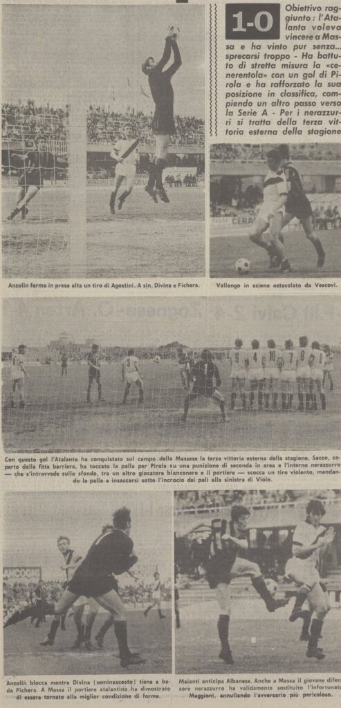 Passiamo a Pasqua sul campo del fanalino di coda Massese, già praticamente retrocesso, c’è pochissima gente (anche perchè la società locale istuisce la “giornata bianconera” cioè pagano pure gli abbonati, un’usanza d’epoca che si faceva una volta a stagione, fortunatamente l’Atalanta non l’ha mai seguita).