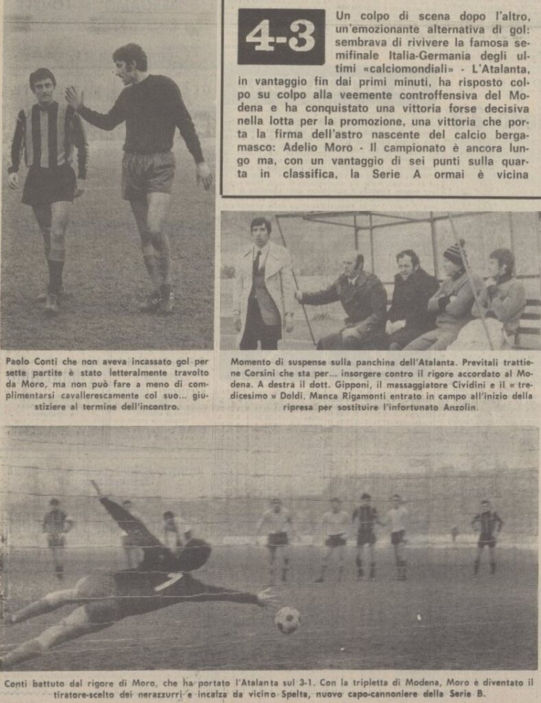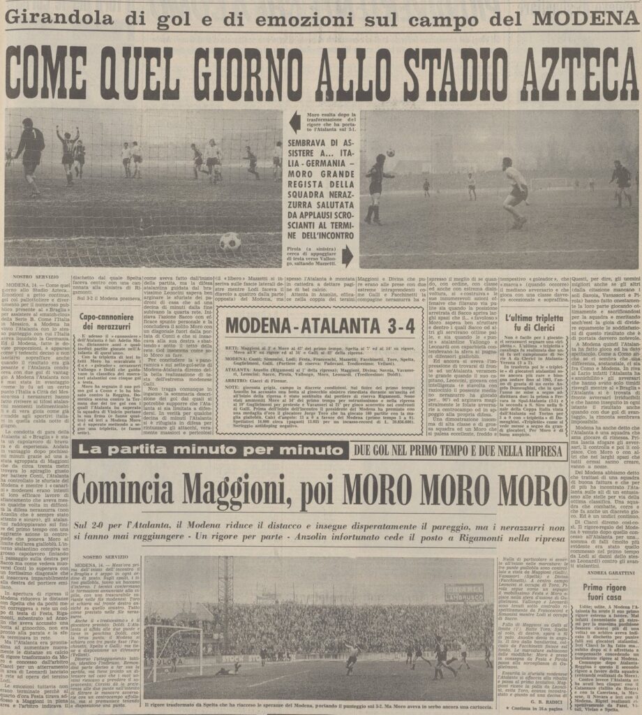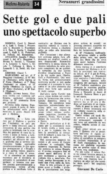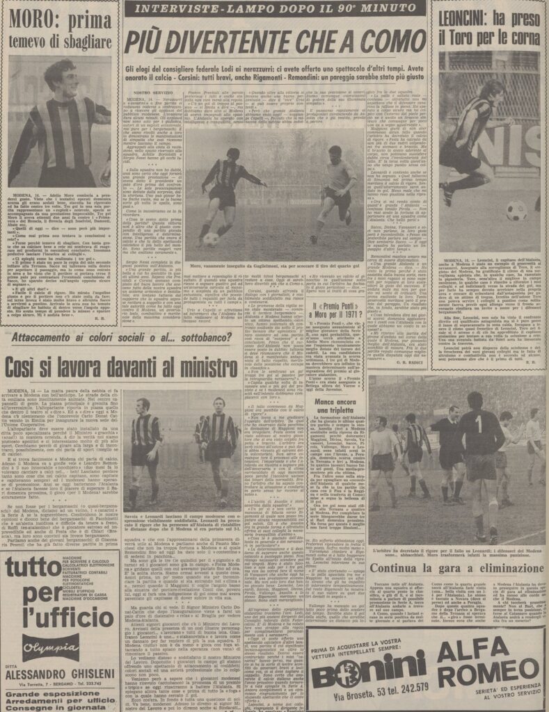 Nel Modena c’è il futuro atalantino Festa, spicca anche la presenza del cileno Toro protagonista della rissa ai mondiali del 1962 con i nazionali italiani, certo nel 1971 Toro ha ormai trentadue anni, ormai una bandiera del Modena nel quale militava dal 1963 con una parentesi di una stagione al Verona.
