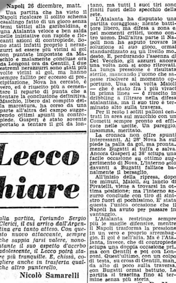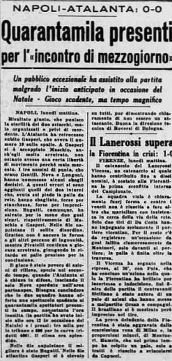 E’ una della ultime volte che si va in campo il giorno di Natale (fino a circa metà anni sessanta) e portiamo a casa un punto da Napoli, i padroni di casa non sono in una grande annata e a fine campionato arriveranno penultimi davanti alla Lazio finendo in Serie B.