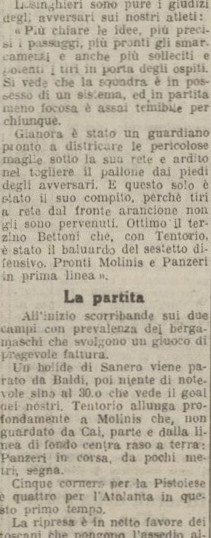 E’ l’anno della prima retrocessione in Serie C e si vede, pochi risultati e violente polemiche soprattutto tra il giornalista dell’Eco Pesenti (praticamente il Corbani dell’epoca, affezionatissimo ai colori nerazzurri) e la società che è retta da dei “commissari” e i cui comunicati sono volentieri ospitati dall’altro giornale cittadino “La voce di Bergamo” ben felice di andar contro l’Eco.