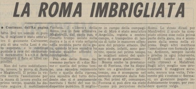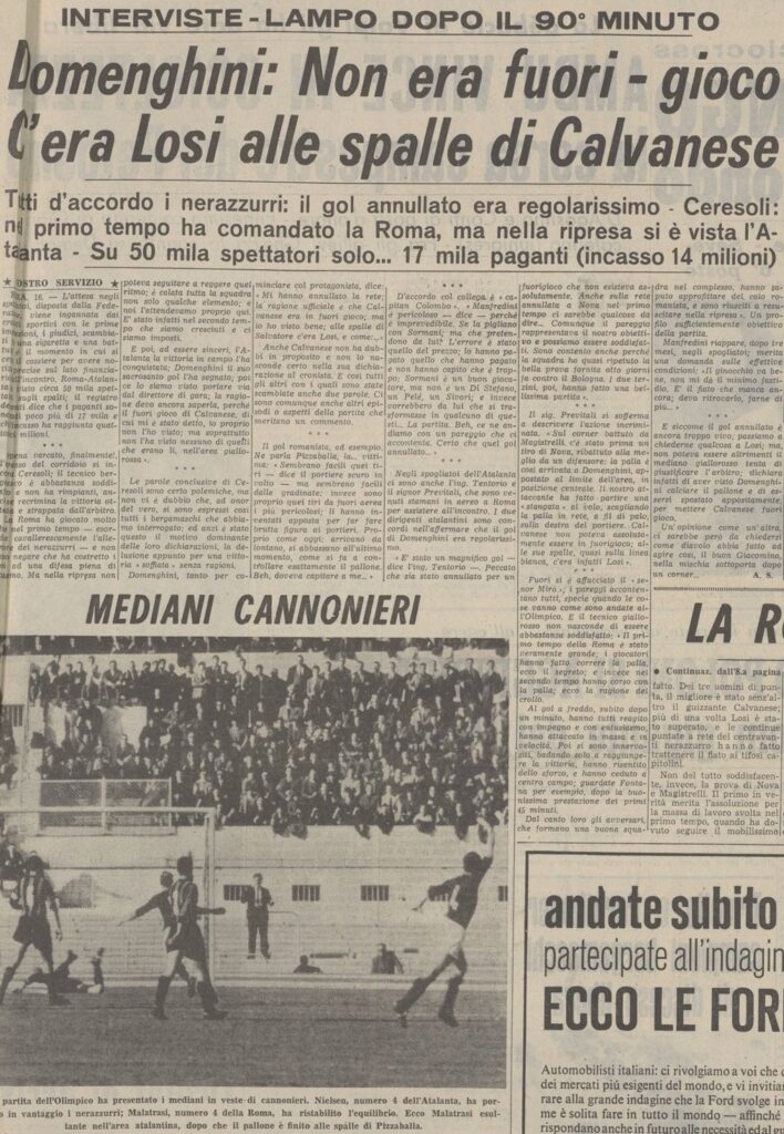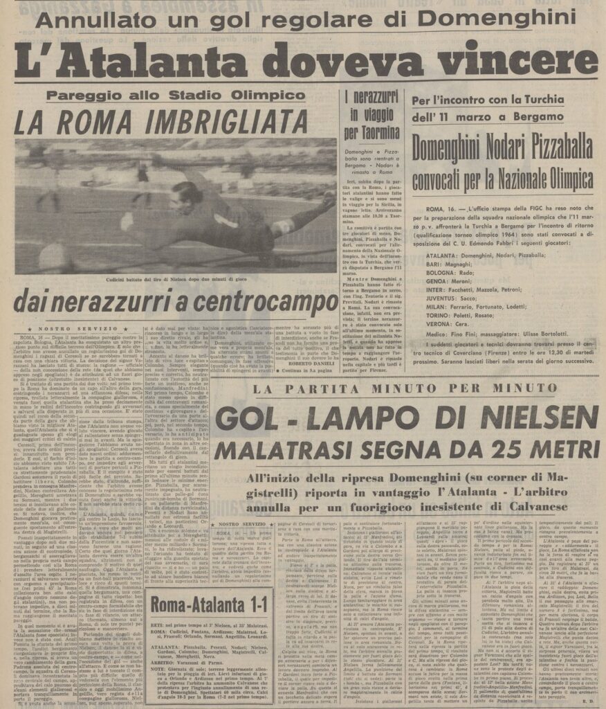 All’Olimpico andiamo in vantaggio dopo due minuti con Nielsen dopo una combinazione con Calvanese, c’è Nova in netto fuorigioco ma non partecipa all’azione, certo siamo negli anni sessanta e sarebbe comunque punibile, l’assistente sbandiera ma l’arbitro convalida.