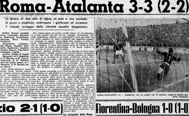 Spettacolare pareggio allo Stadio Nazionale di Roma (che è poi il Flaminio) andiamo due volte in svantaggio e una volta in vantaggio ma poi finisce pari (e la Roma sbaglia due rigori, uno alto e uno parato).