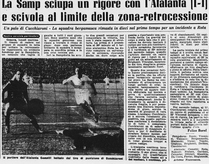 Ottava partita utile consecutiva, pareggiamo a Marassi in una partita dove giochiamo in inferiorità da metà primo tempo, Rota dopo un bel salvataggio si procura una profonda ferita a una gamba e deve uscire definitivamente, i cambi non esistono ancora,