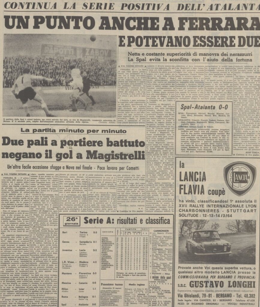 Peraltro la partita a Ferrara la facciamo noi, siamo più forti e non la vinciamo solo per sfortuna, Magistrelli prende due pali a portirere battuto, Nova sbaglia un’occasione, la Spal rimane anche in inferiorità numerica per alcuni minuti causa infortuni, anche Nielsen ha un problema all’inguine ma siamo nel 1964 tutti o restano in campo all’ala o se devono uscire vengono curati e rimandati in campo, i cambi non esistono ancora.
