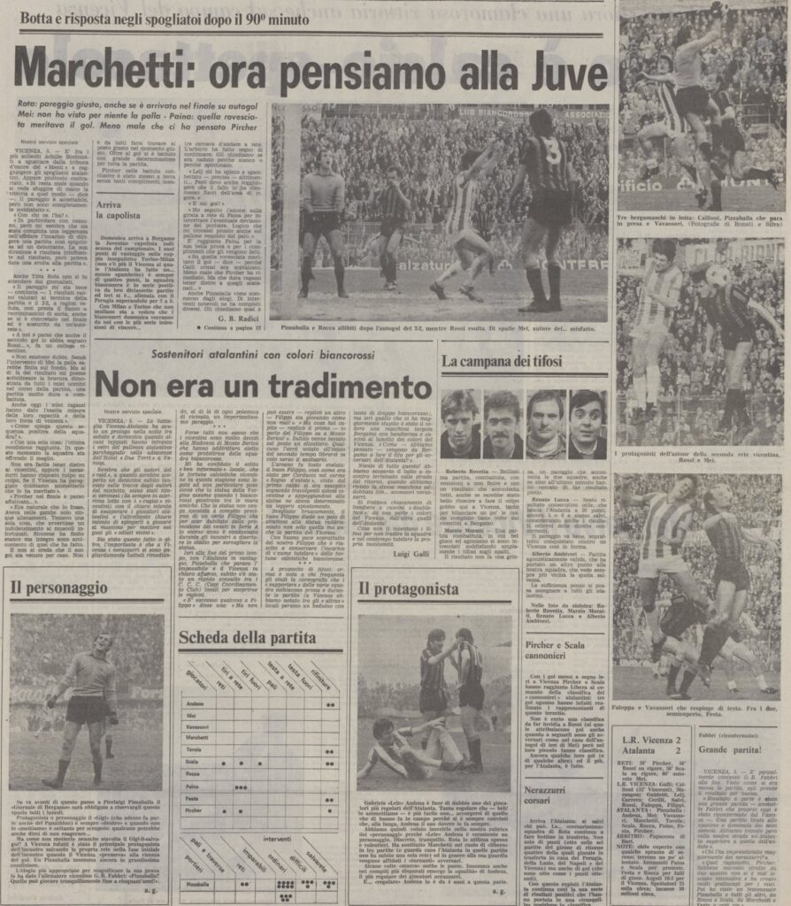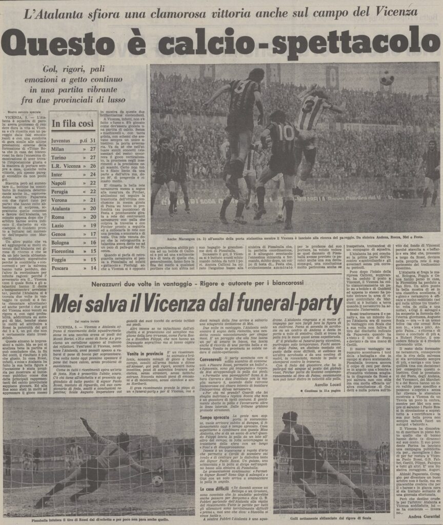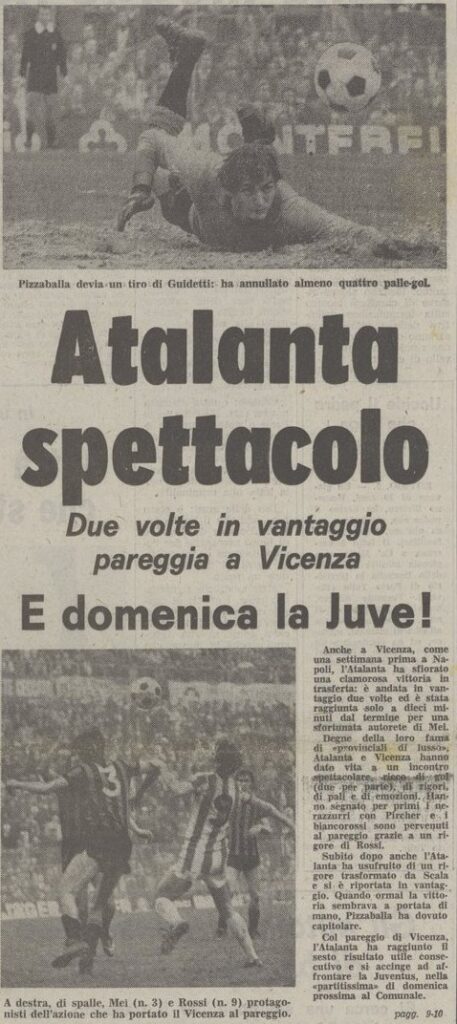 Il portiere impegnato è Pizzaballa che fa una grande parata su una schiacciata di testa di Rossi che si stava infilando proprio nell’angolo.